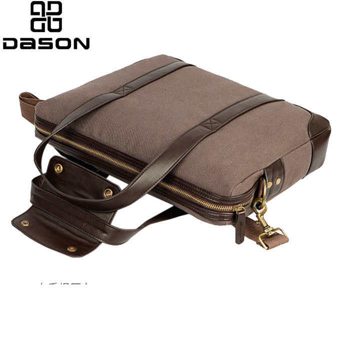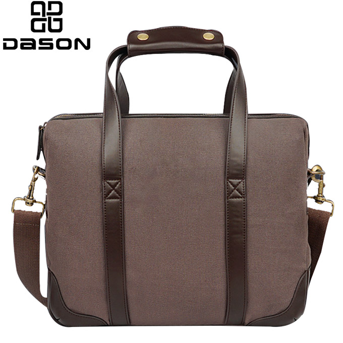 حقيبة كمبيوتر محمول من القماش بتصميم مع مقبض كلاسيكي من الجلد وحزام كتف من النايلون، مع خطاف وإبزيم برونزي